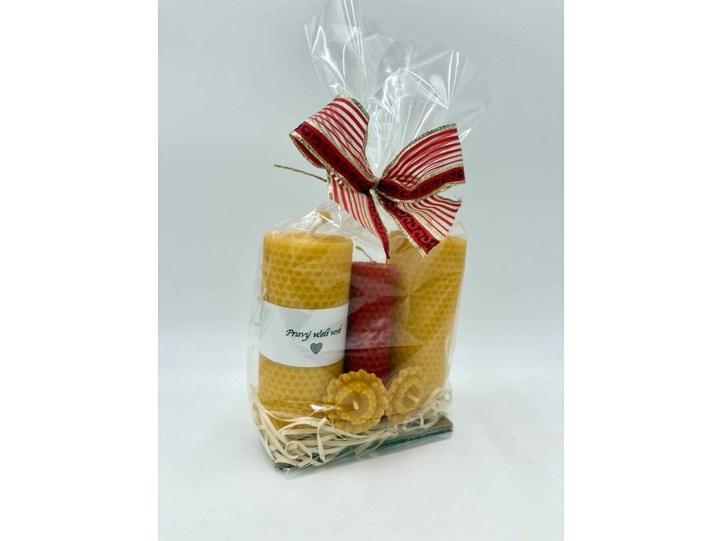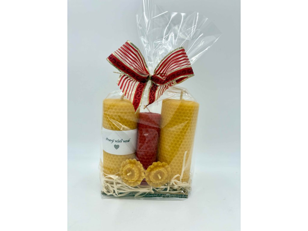 Dárkové balení voskových svíček obsahuje točené svíčky z pravých voskových mezistěn, které vyrábí přímo my, v naší provozovně Včelařství Thomayer.